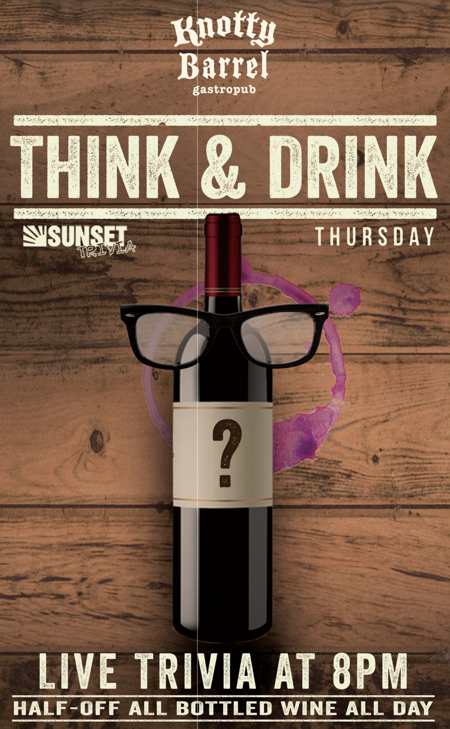 2026-01-01 20:00:002026-01-01 22:00:00America/Los_AngelesWeekly Trivia - Featuring Sunset TriviaJoin us every Thursday for Sunset Trivia here at Knotty Barrel! Kicking off at 8pm each week this event is fun for groups of friends, family night or a date night. Half off all bottles of wine all day Thursday also available. Knotty Barrel East VillageKnotty Barrel East Villageinfo@knottybarrel.com